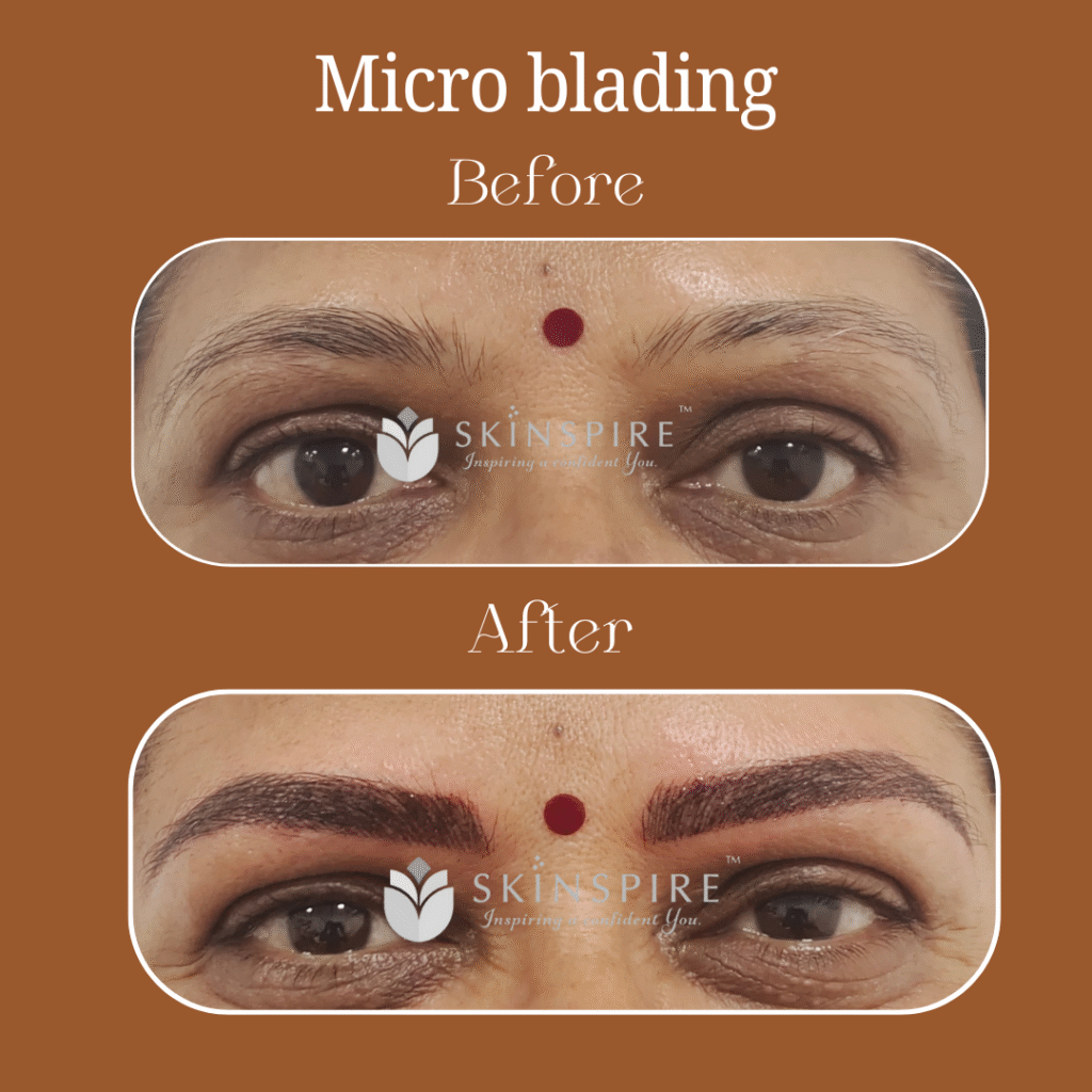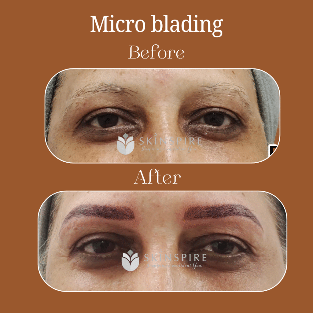 Microblading is a semi-permanent eyebrow enhancement technique where pigment is manually deposited into the upper layers of the skin using fine, blade-like needles. It helps shape, define, and fill sparse brows with a natural look that lasts for 12–18 months. The results are smudge-proof and tailored to suit your facial features and skin tone.