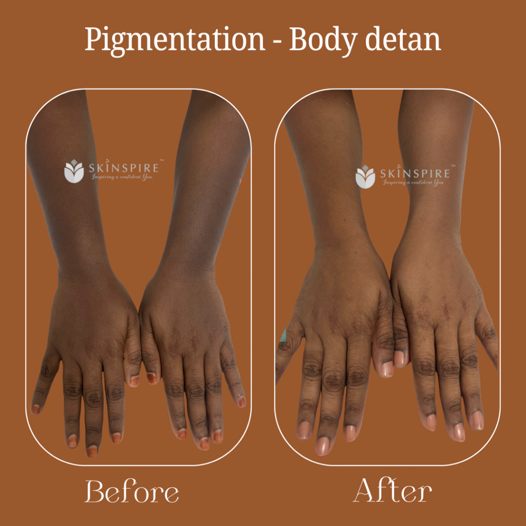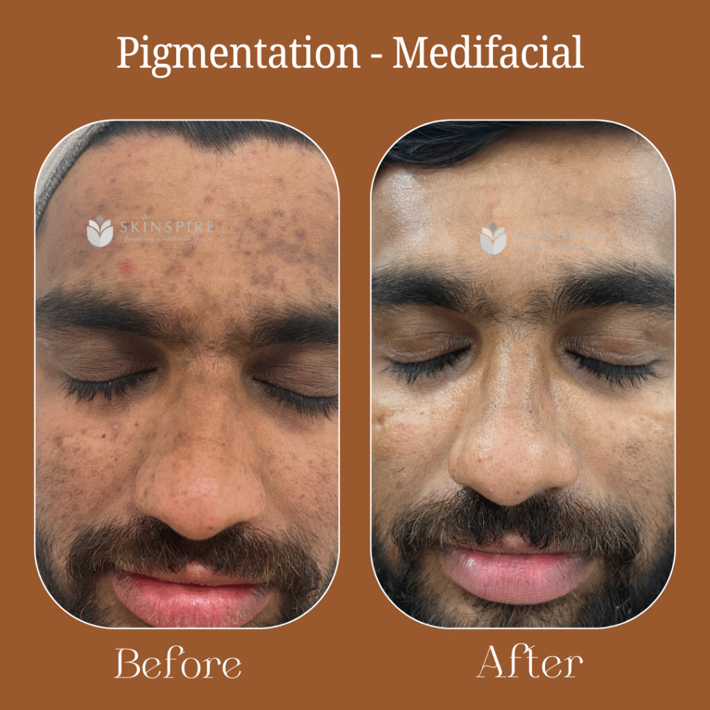 Pigmentation treatments aim to reduce excess melanin deposits caused by sun exposure, hormonal changes, acne, or skin injuries. A combination of topical depigmenting agents, chemical peels, and laser therapies like Q-switch are used depending on the depth and type of pigmentation. These treatments are customized based on skin type to safely restore an even and radiant complexion.